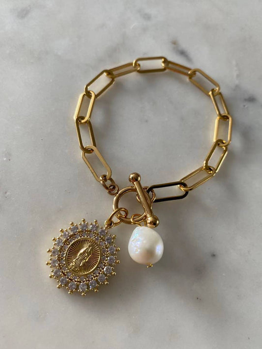 Our Lady of Lourdes With Freshwater Pearl Paperclip Chain Bracelet