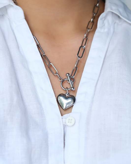 Medium Puff Heart Silver Toggle Lock Shiloh Chain Necklace