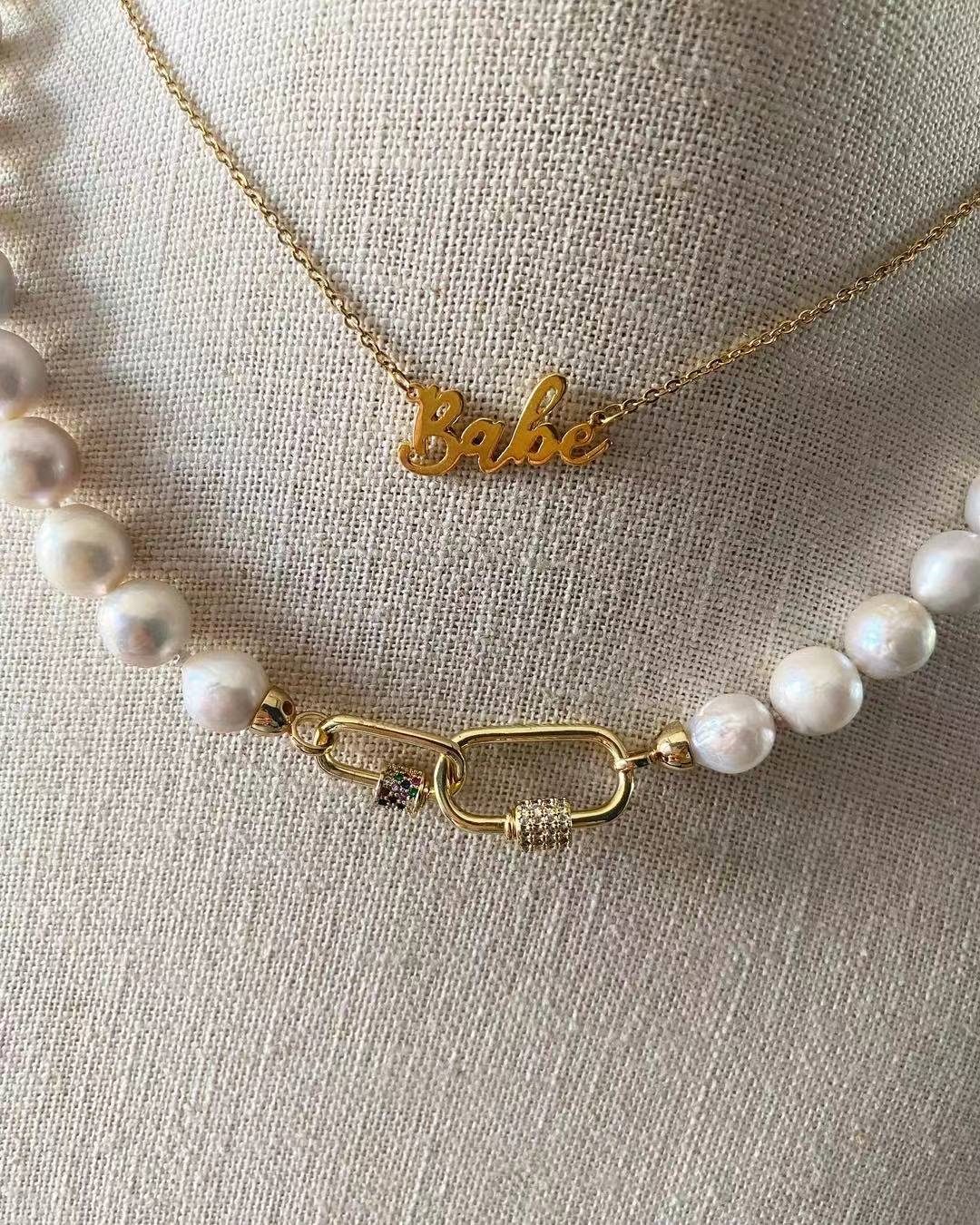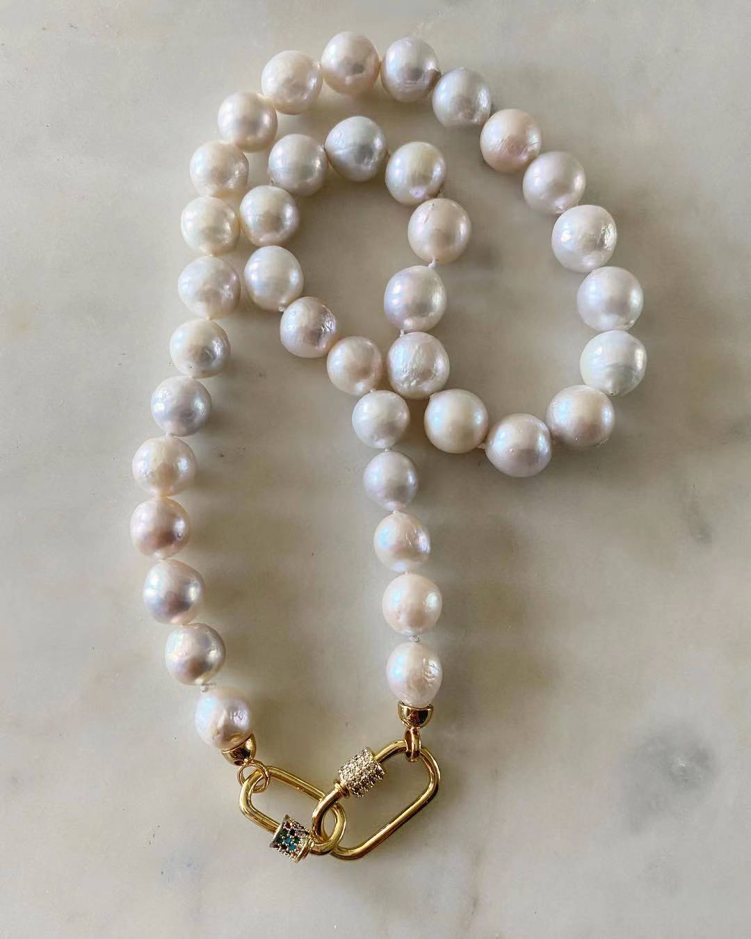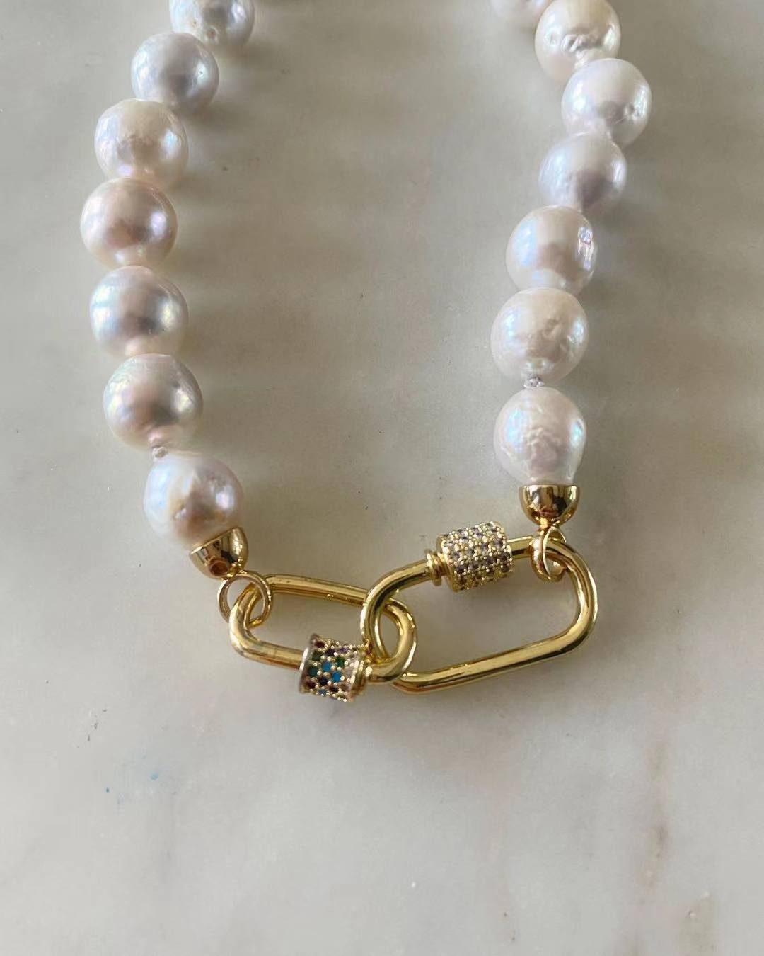 Material: Baroque freshwater pearls. Carabiners are gold plated with fashion stones. Hypoallergenic.