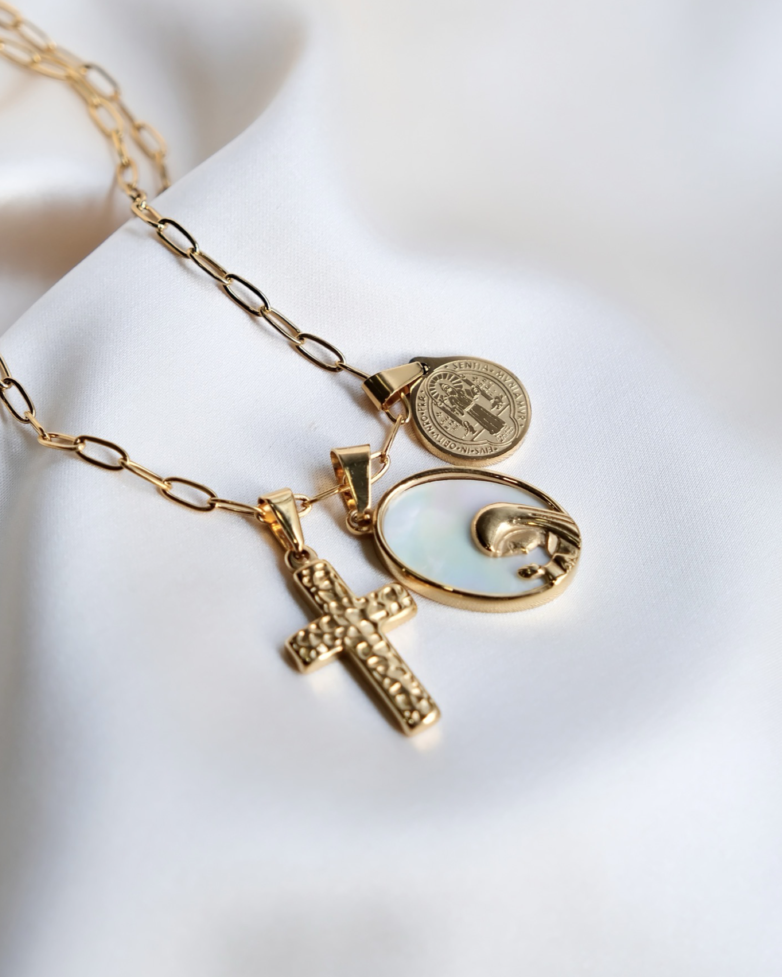 Various medals and pendants featuring images of saints. Wear this as tokens of devotion.