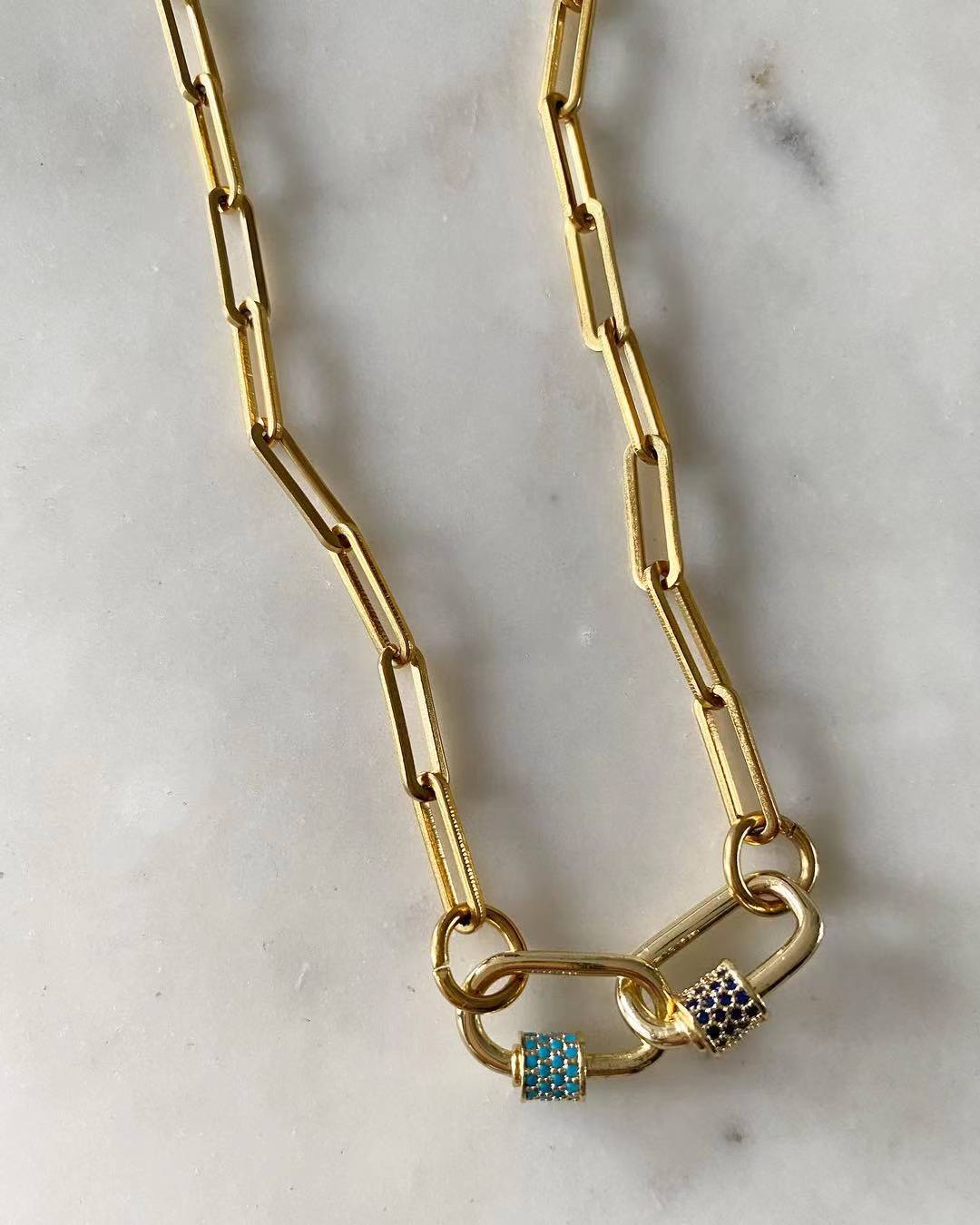Material: Chain necklace is made of stainless steel plating. Non tarnish and Hypoallergenic. Gold carabiners are gold plated with fashion stones.