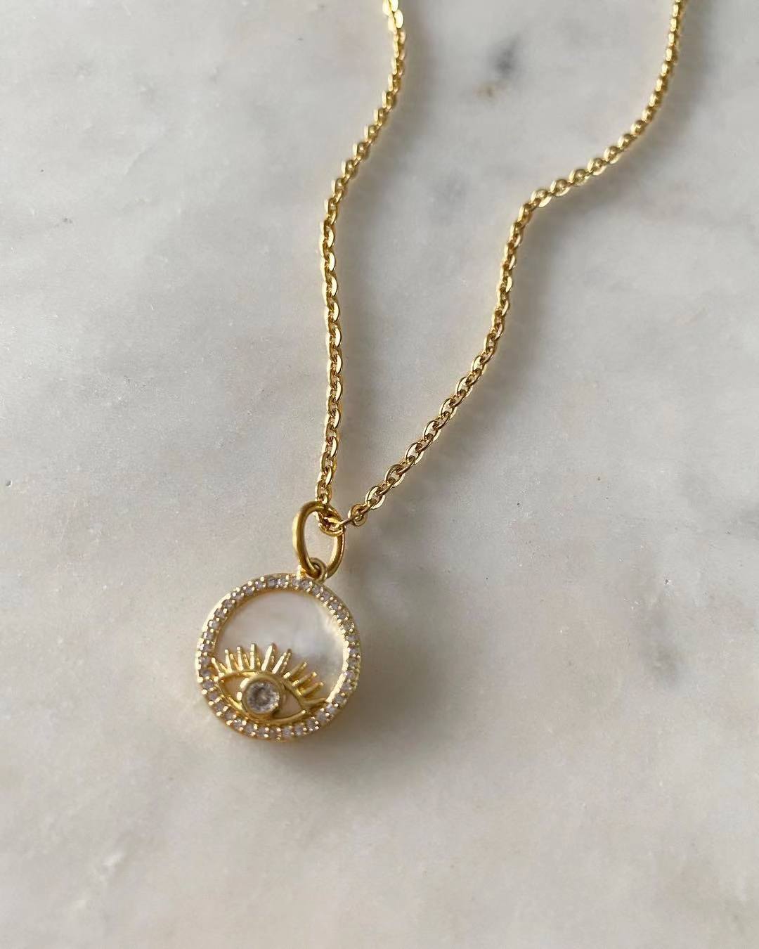 Material: Stainless steel chain is non tarnish. Evil eye pendant is made of gold plated with capiz shell and fashion stones. Hypoallergenic.