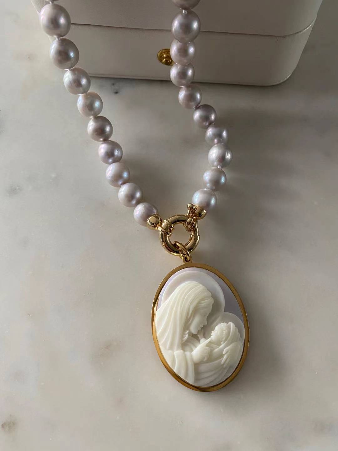 Material: Resin Cameo pendant is made of resin and stainless steel plating. Non tarnish. Baroque pearls may vary in shape and size.