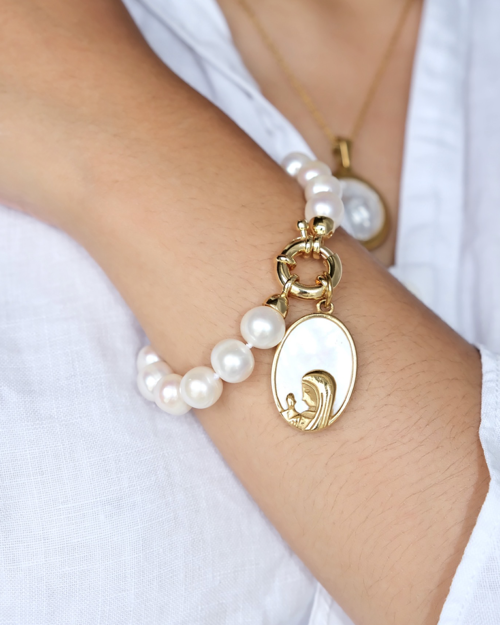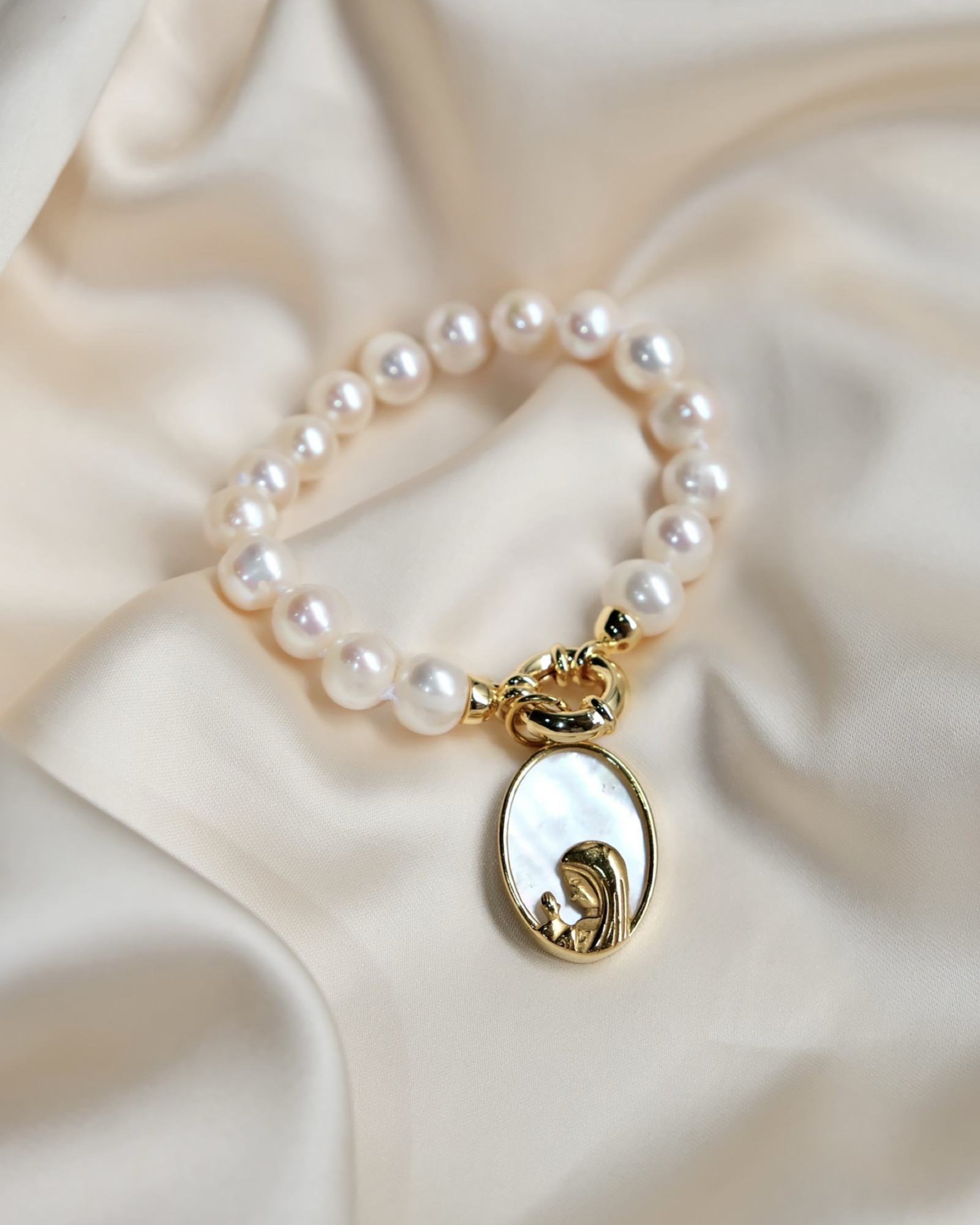 A study in simplicity and grace. This minimalist freshwater pearl bracelet features the medallion of the Blessed Mother, effortlessly blending sophistication with everyday wearability.