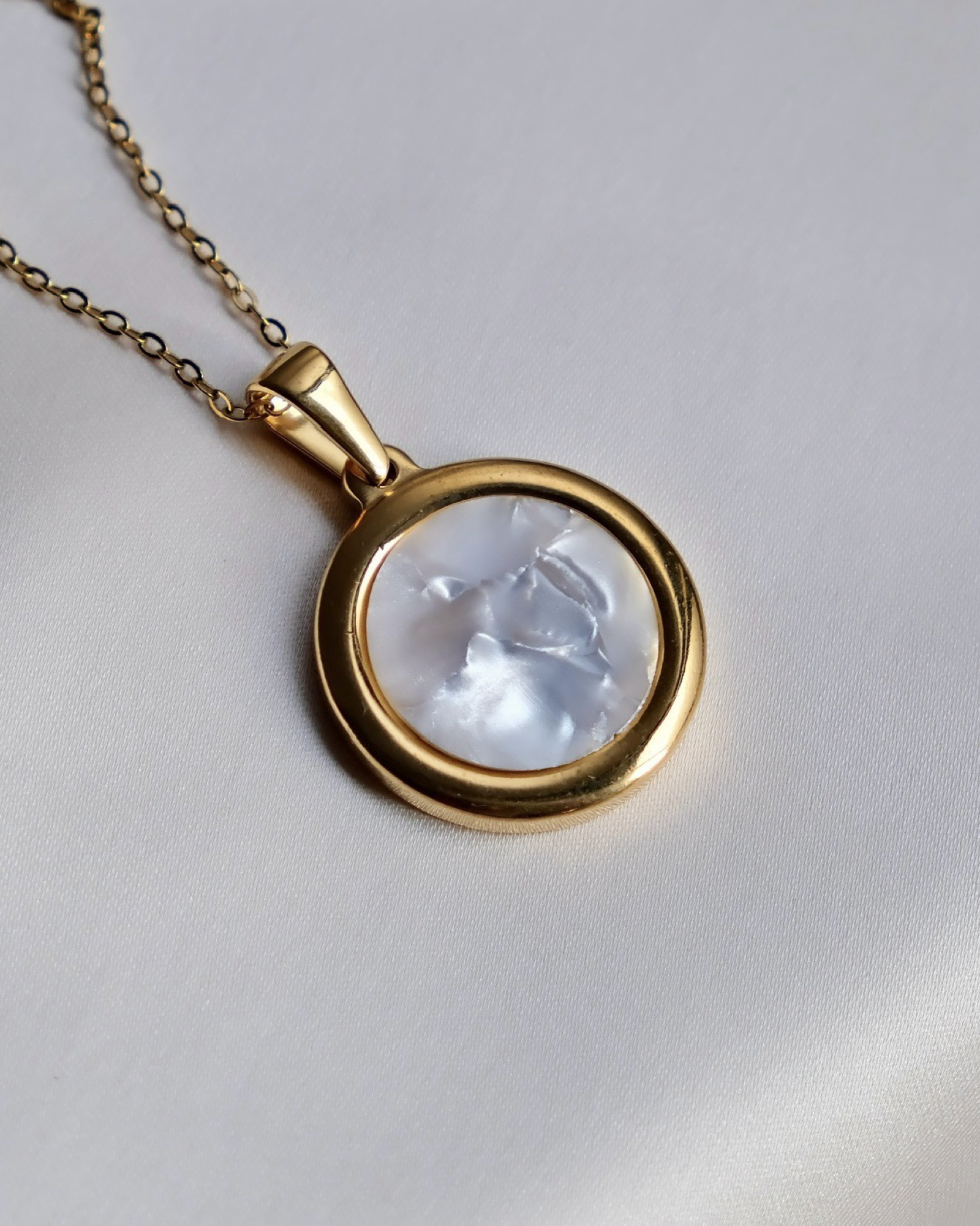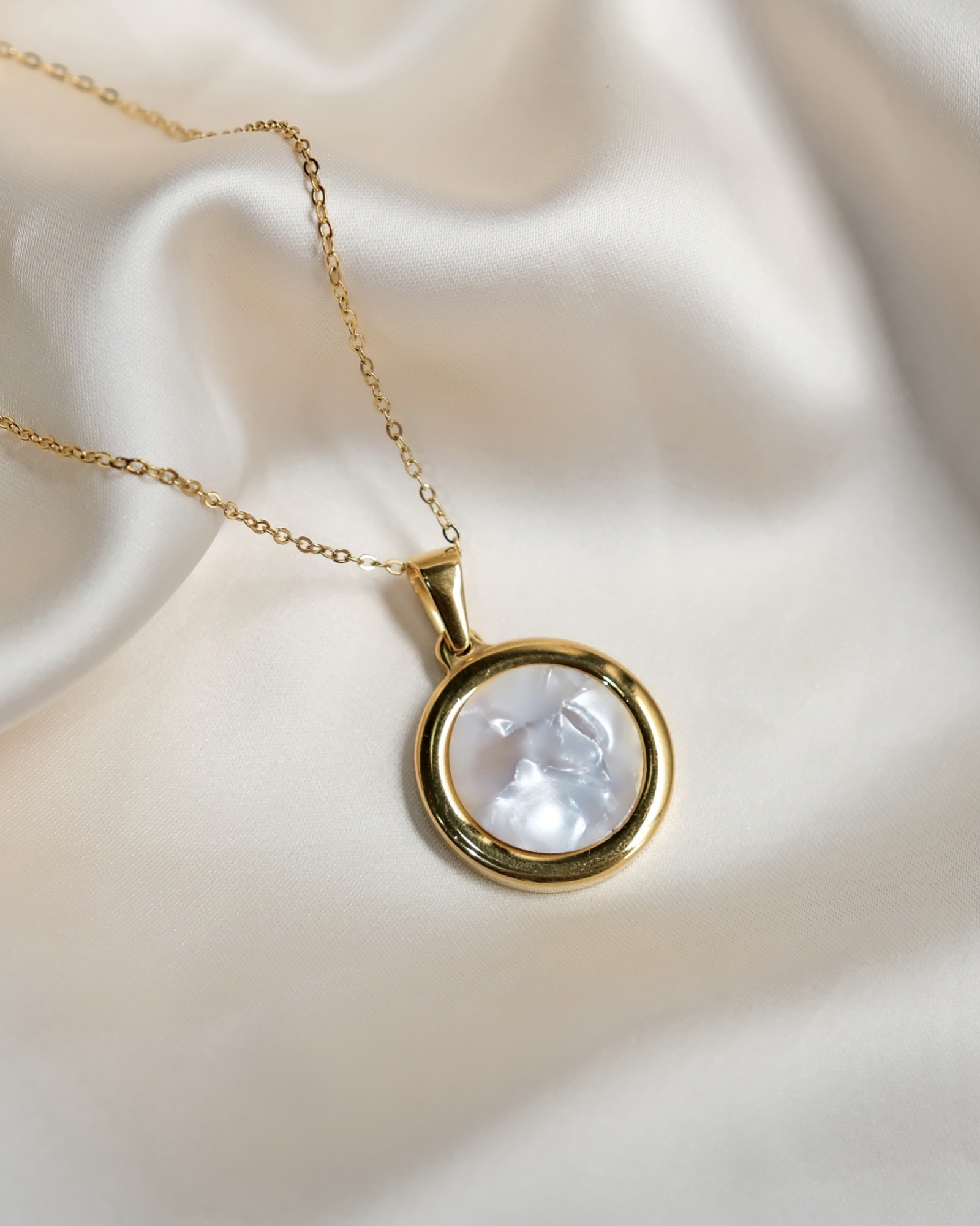This classic capiz-pearl necklace exudes a timeless sophistication that transcends trends.