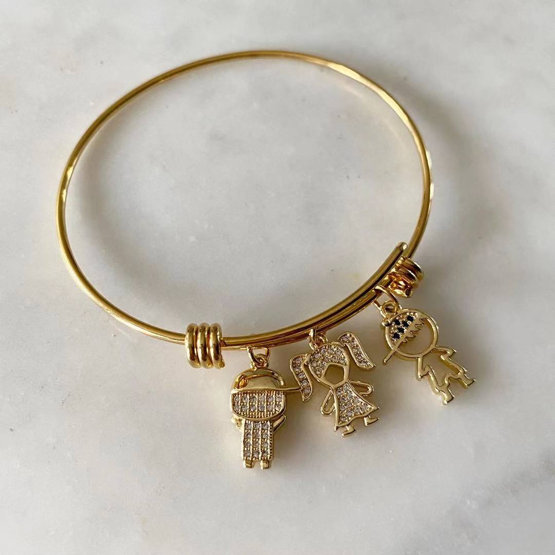 Material: Stainless steel bangle. Non tarnish. Charms are gold plated with fashion stones. Hypoallergenic.