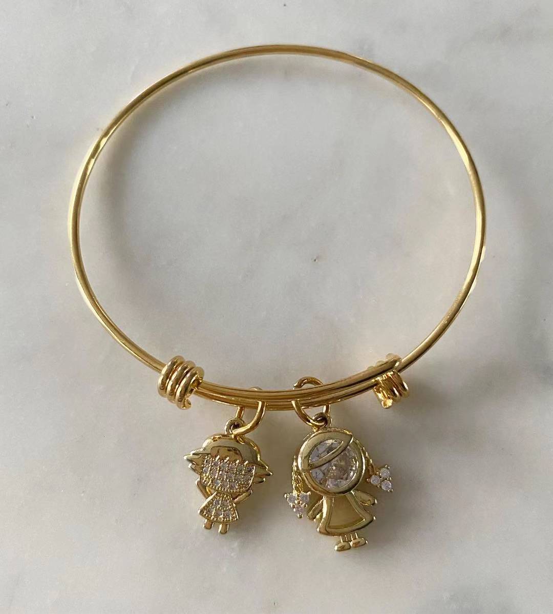 Material: Bangle has stainless steel plating. Girl charms are gold plated. Hypoallergenic.