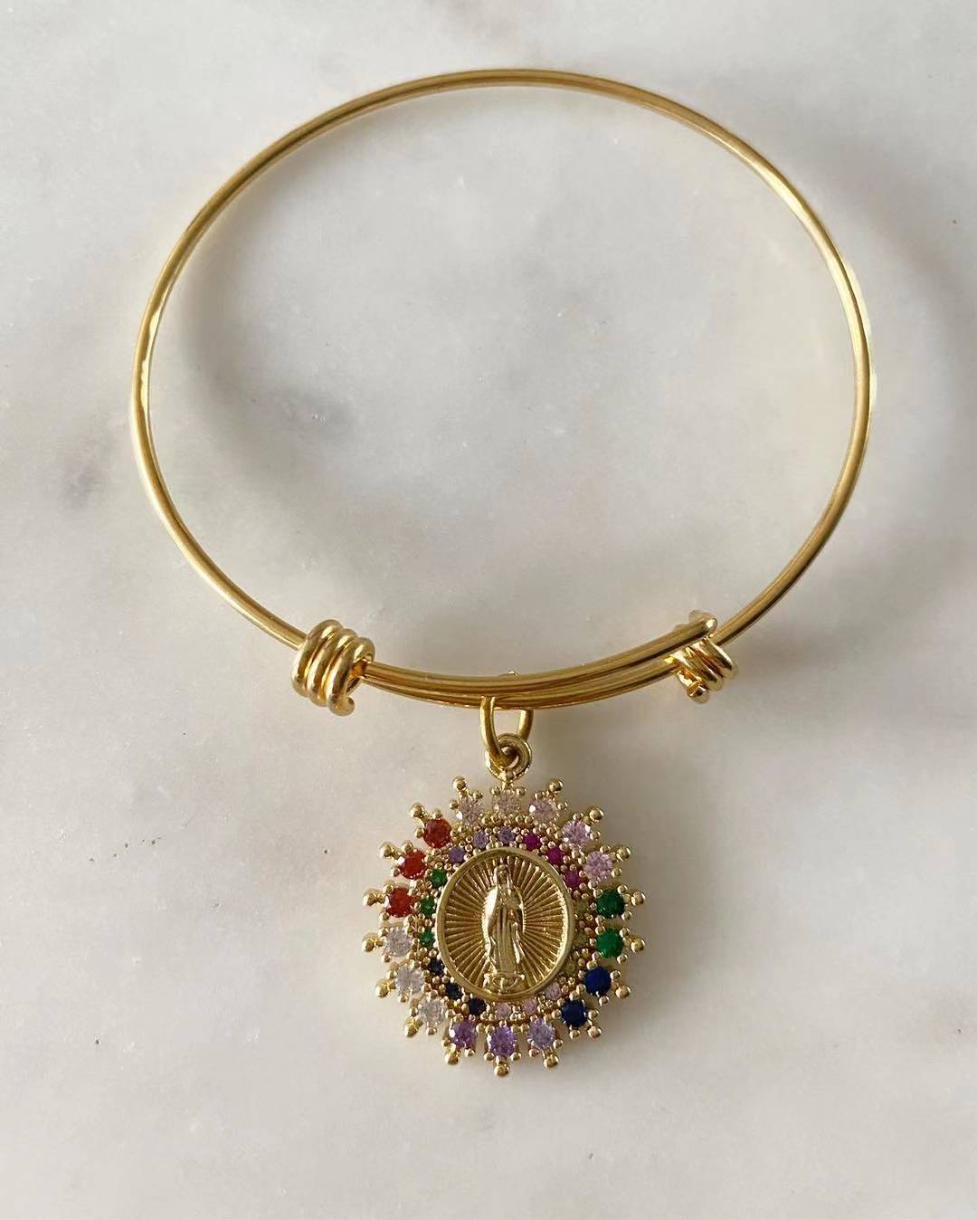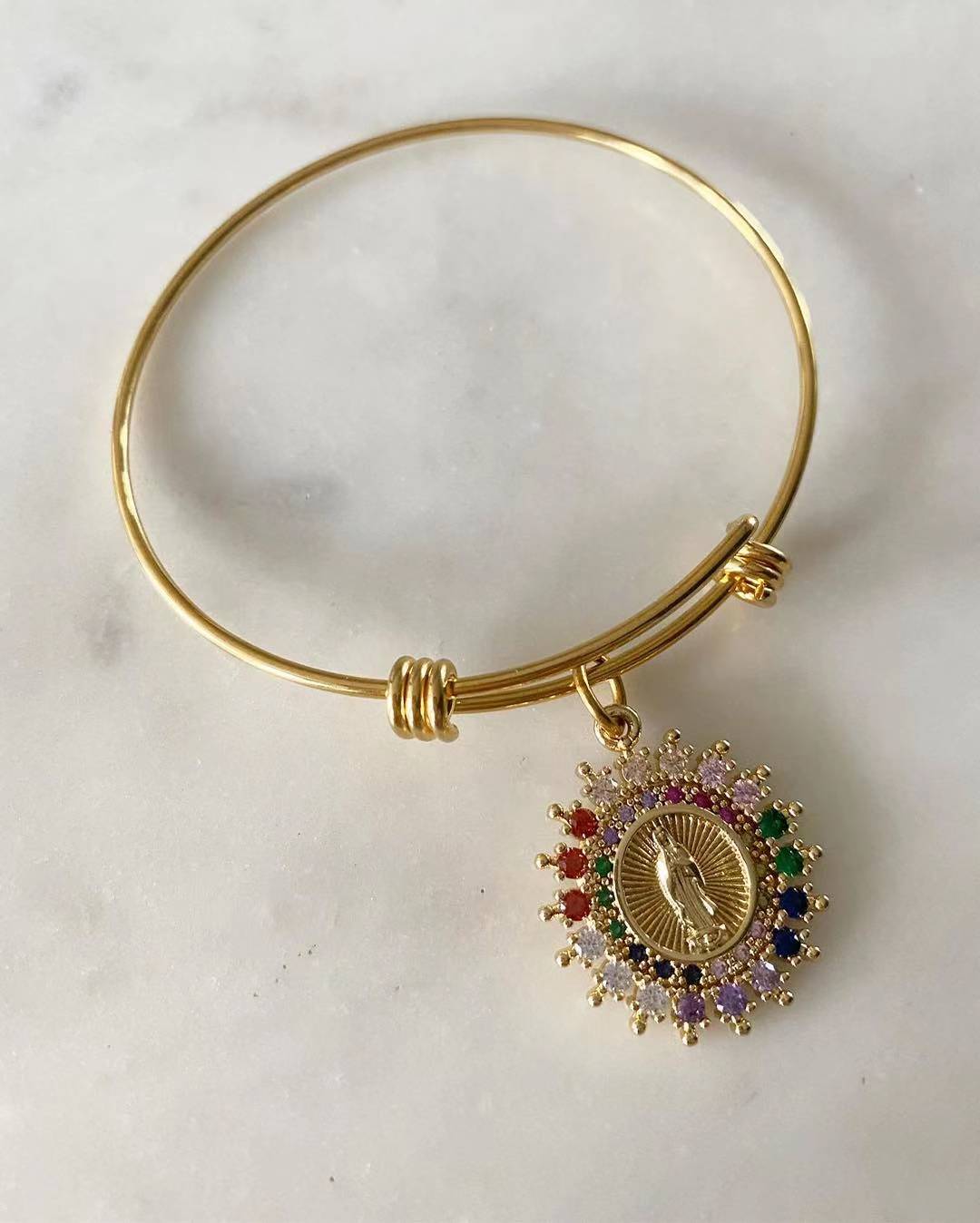 Material: Stainless steel plating bangle. Non tarnish and hypoallergenic. Guadalupe medallion is gold plated with shion stones. Bangle size: one size fits all.