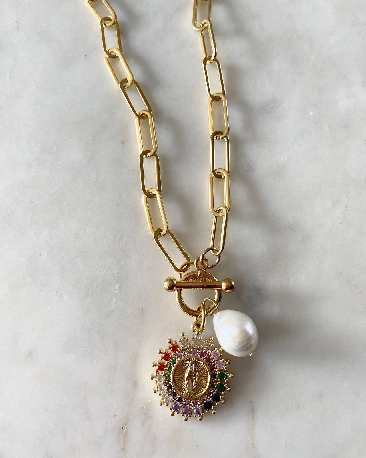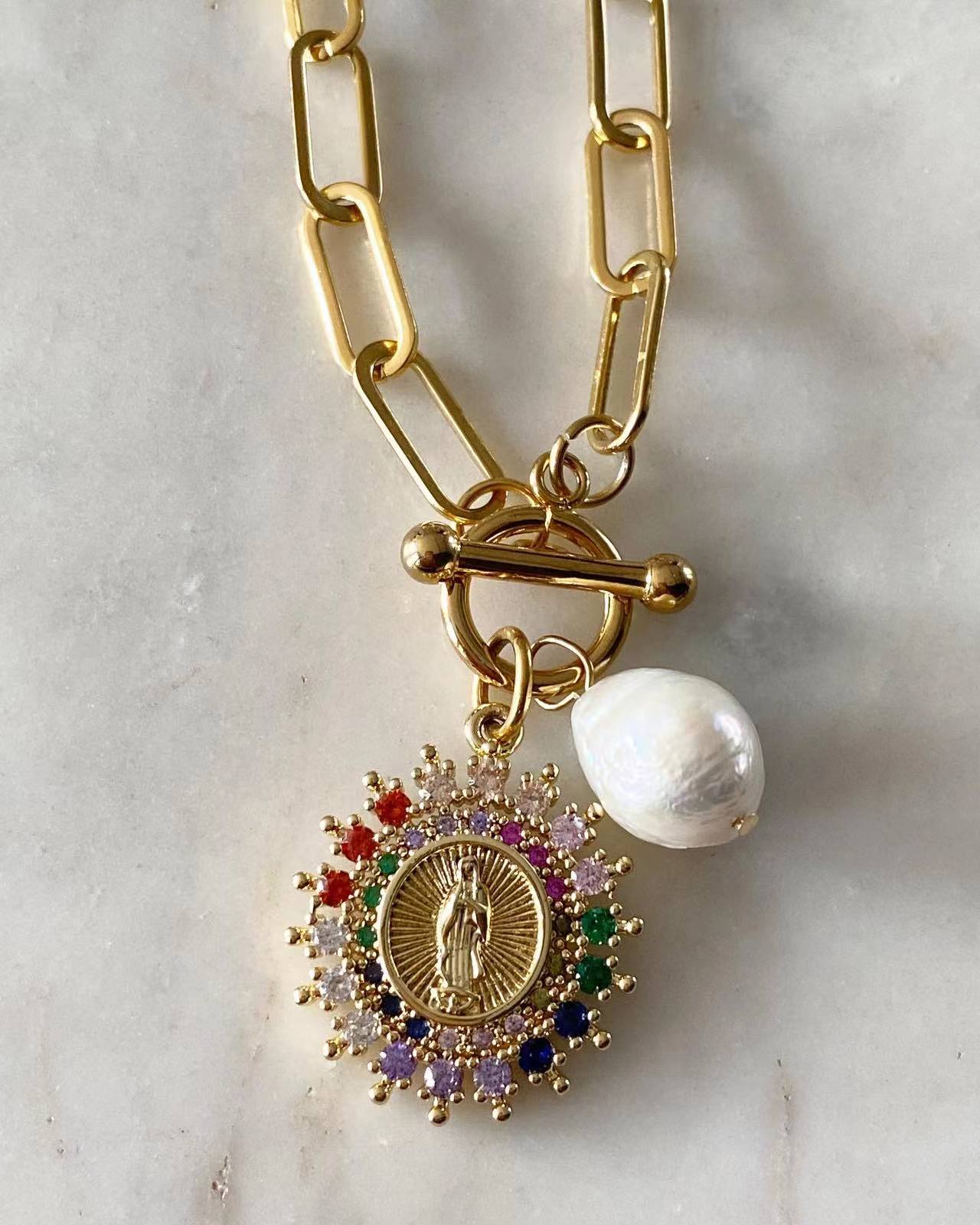 Multicolored Our Lady of Guadalupe Toggle Lock Necklace with Pearl