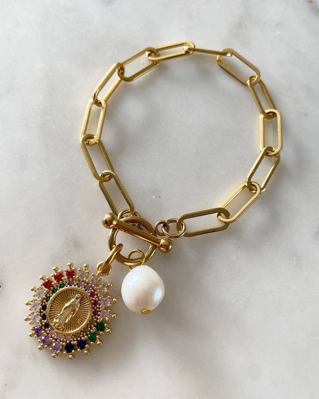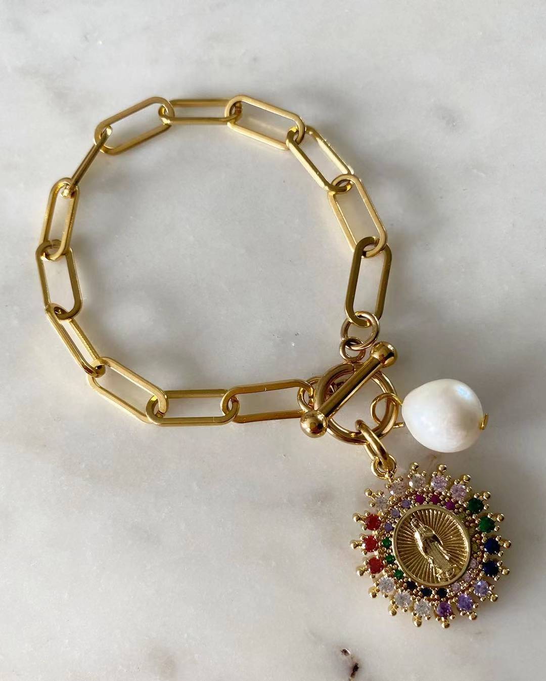 Multicolored Our Lady of Guadalupe with Pearl Toggle Lock Bracelet