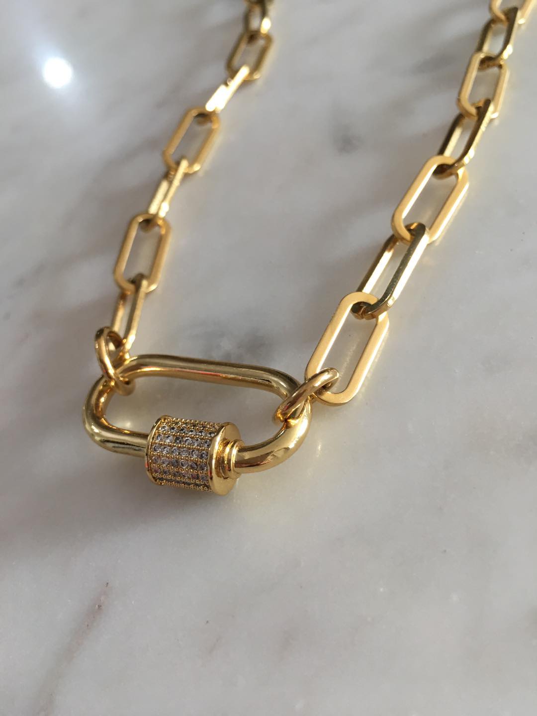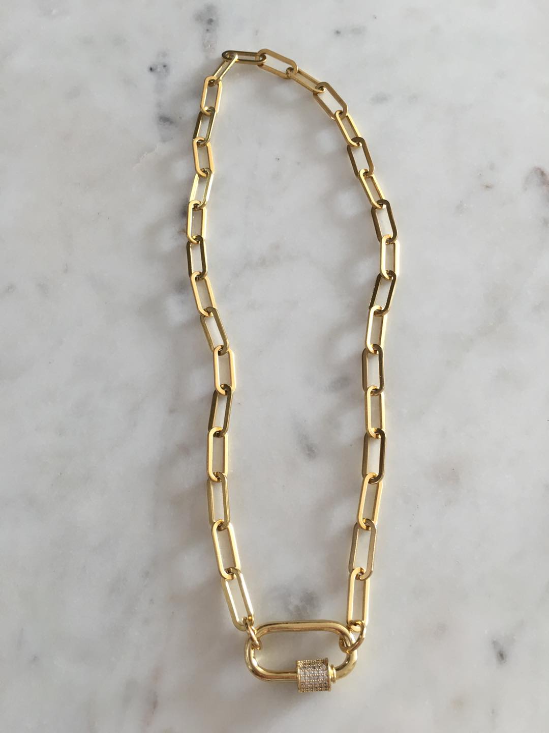 Material: Stainless steel chain-link necklace. Non tarnish. Gold plated oval lock. Hypoallergenic.