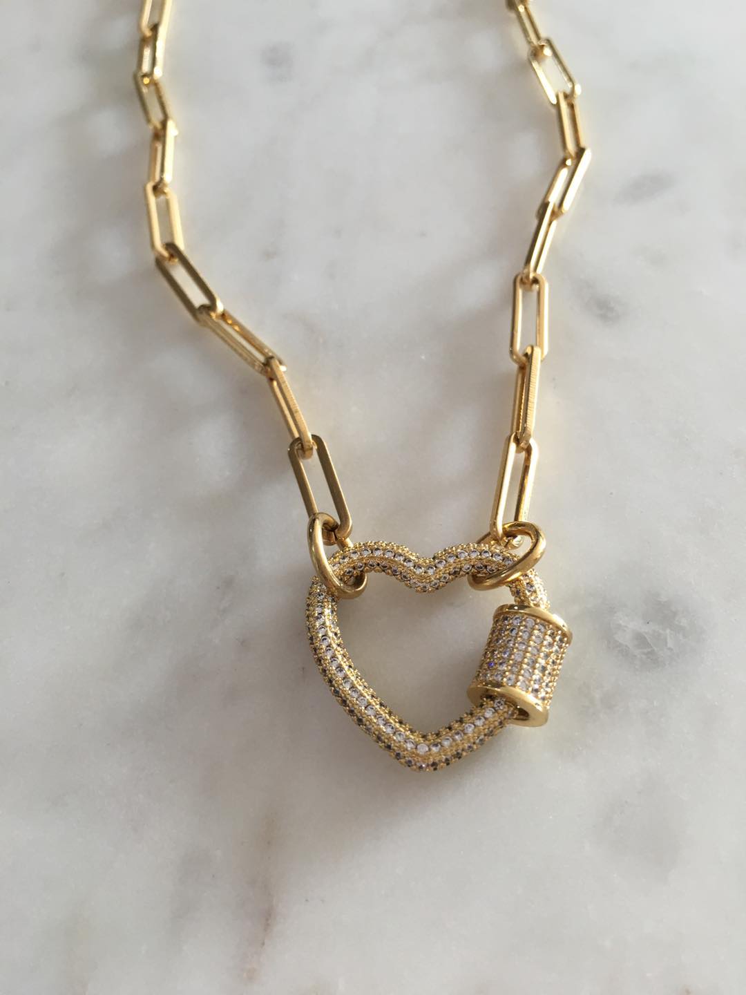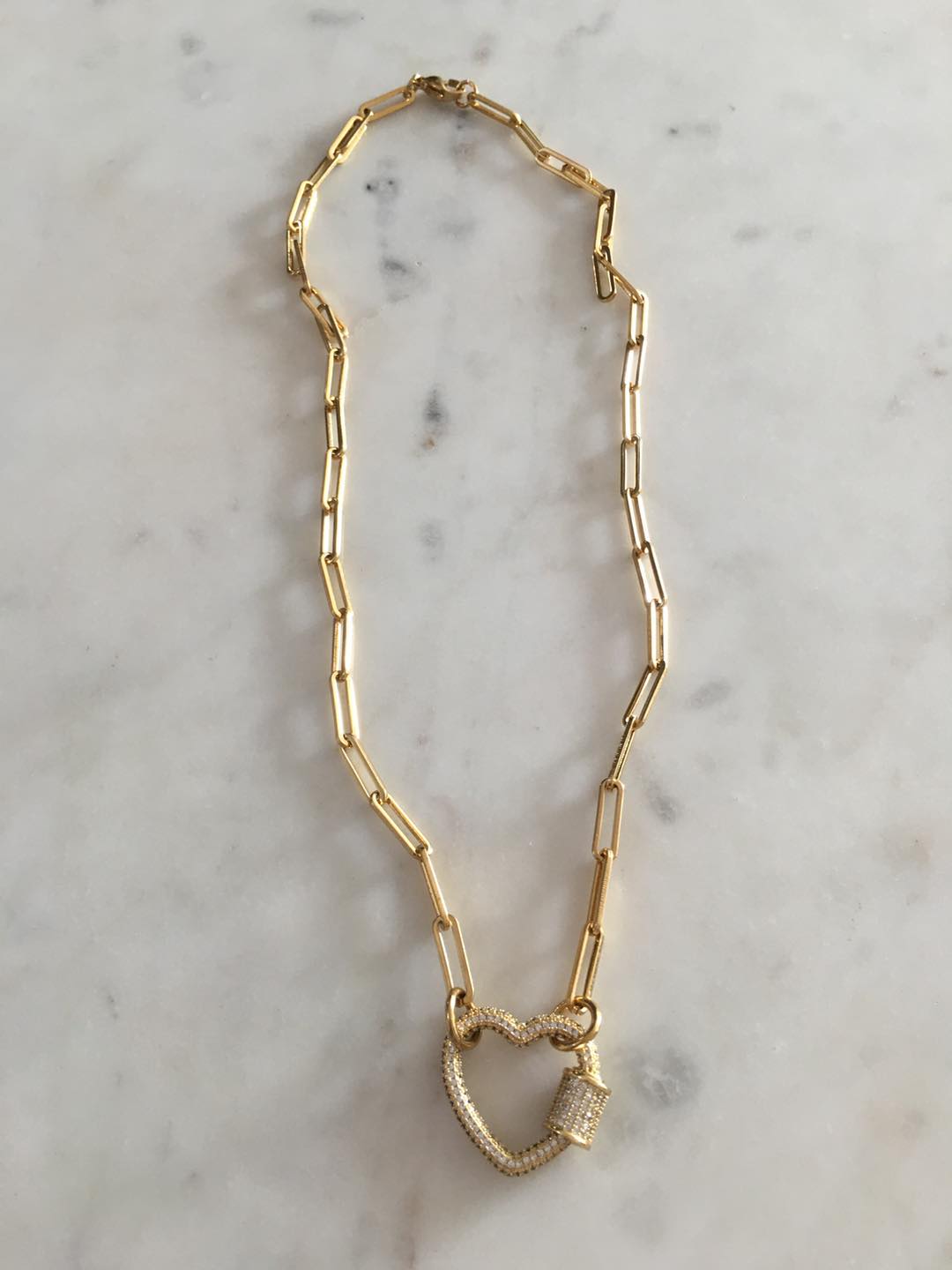 Material: Stainless steel chain-link necklace. Non tarnish. Gold plated heart lock. Hypoallergenic.