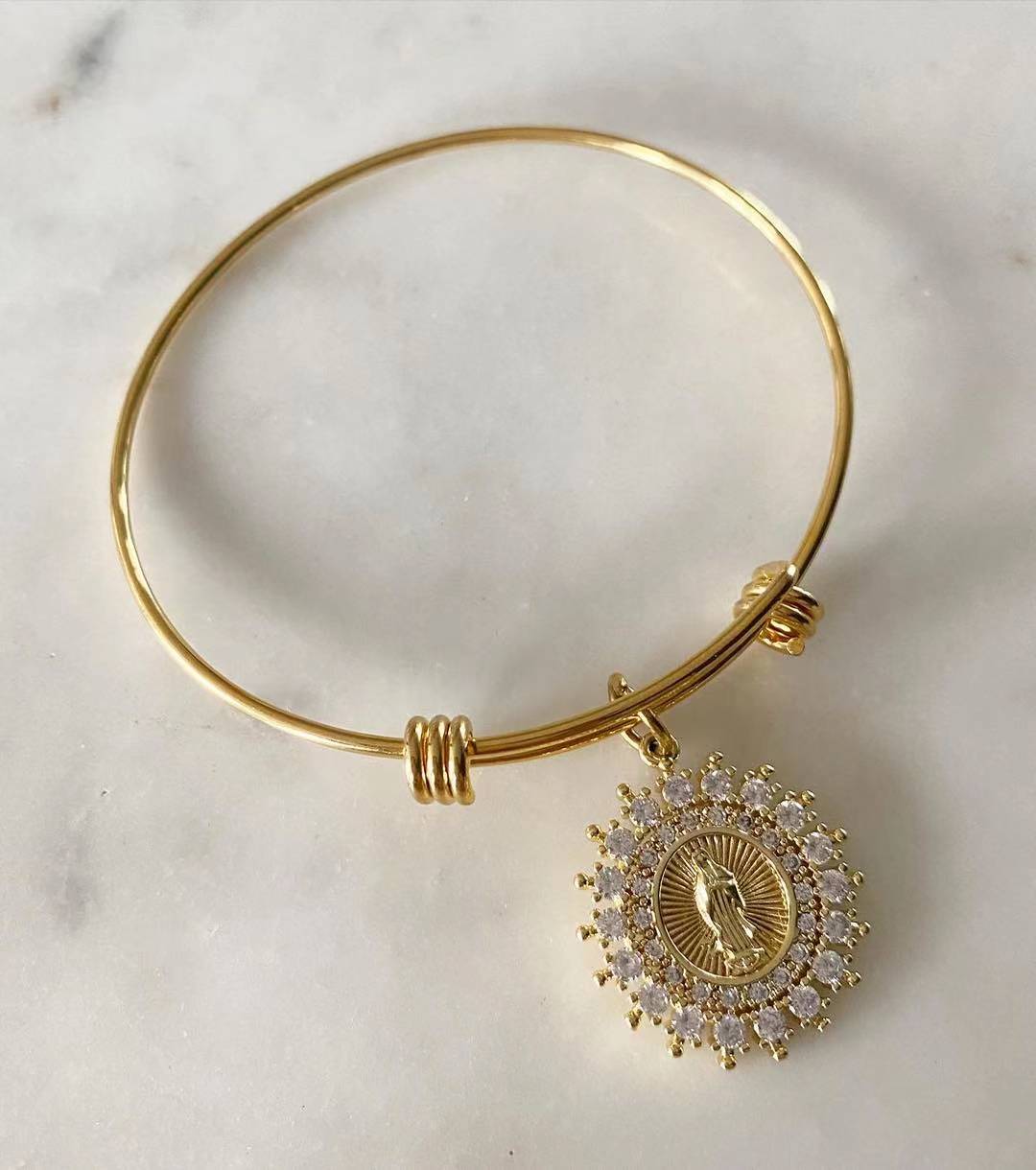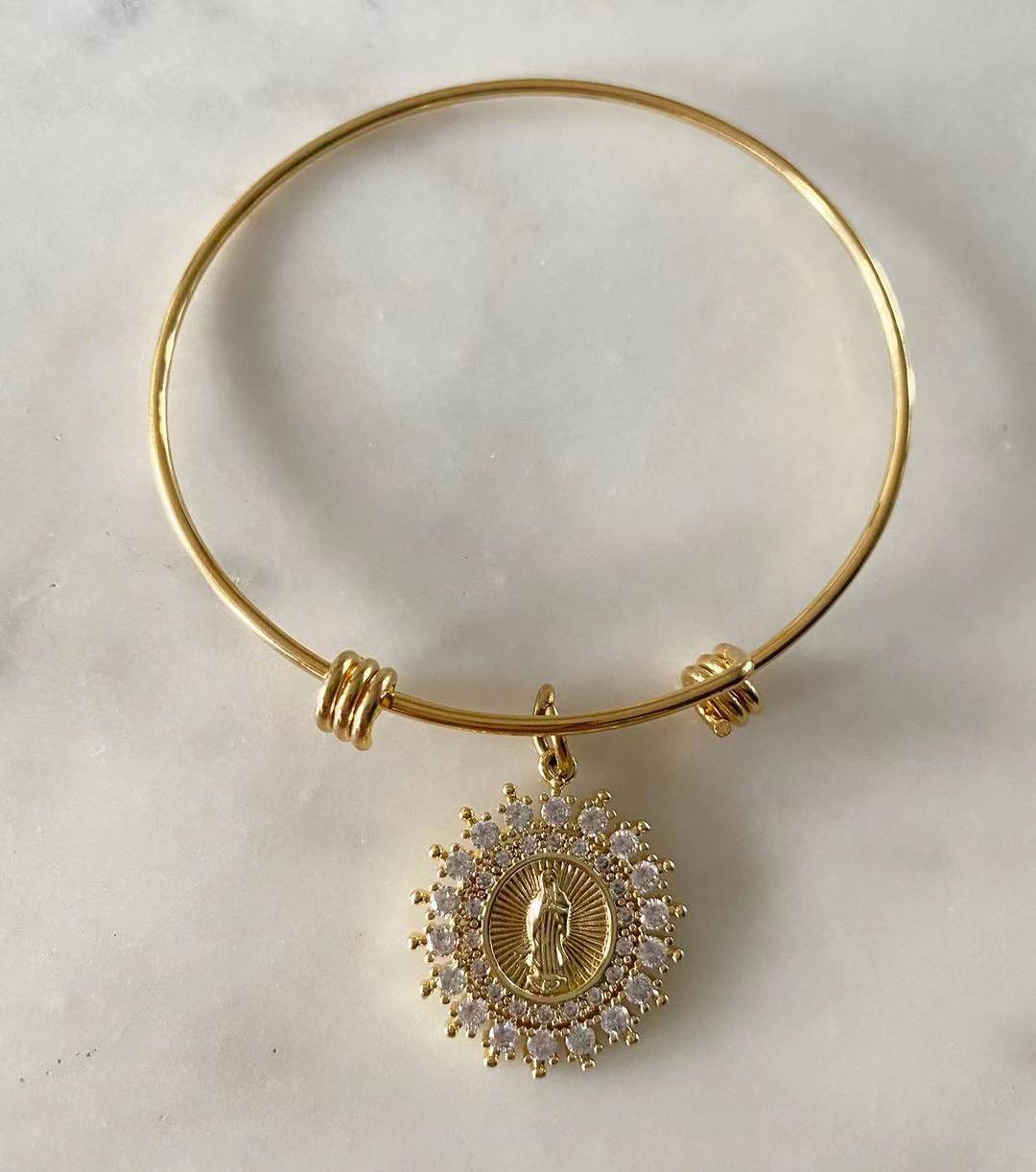 Material: Stainless steel plating bangle. Non tarnish and hypoallergenic. Guadalupe medallion is gold plated with shion stones. Bangle size: one size fits all.