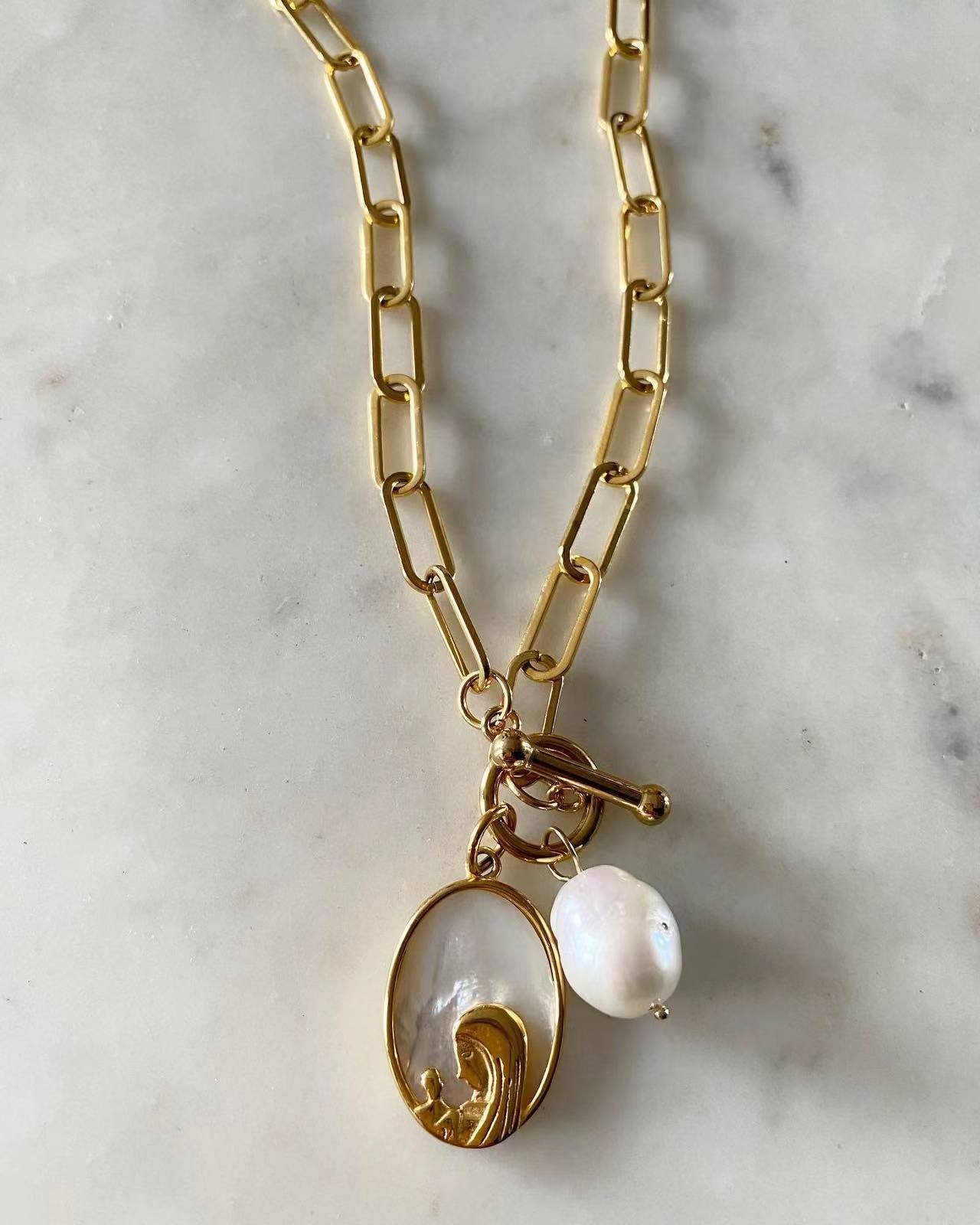 Material: Stainless steel chain and Lourdes pendant are non tarnish. Baroque freshwater pearl may vary in shape and size. Hypoallergenic.