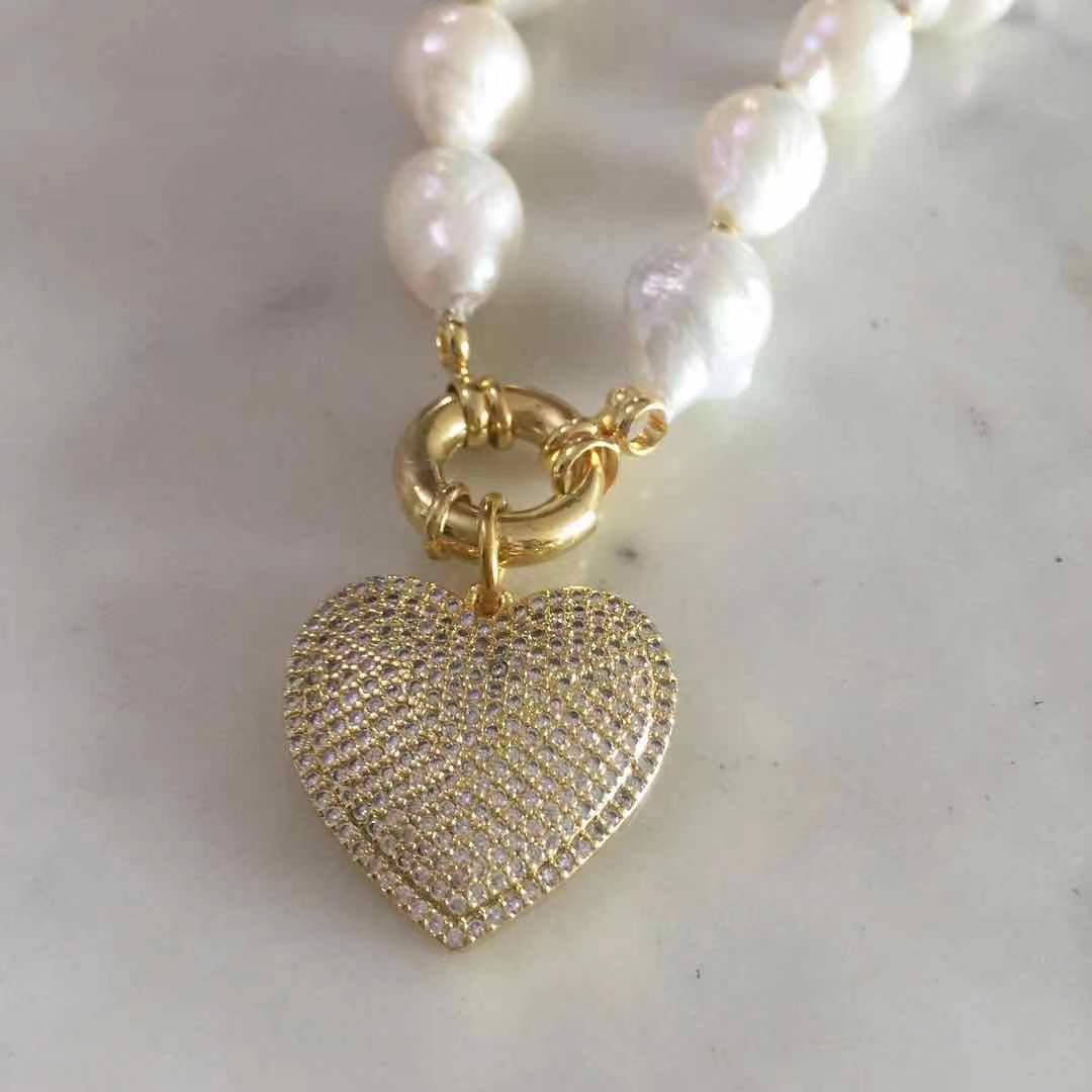 Material: Baroque pearl necklace with gold plated heart pendant and toggle lock. Hypoallergenic.