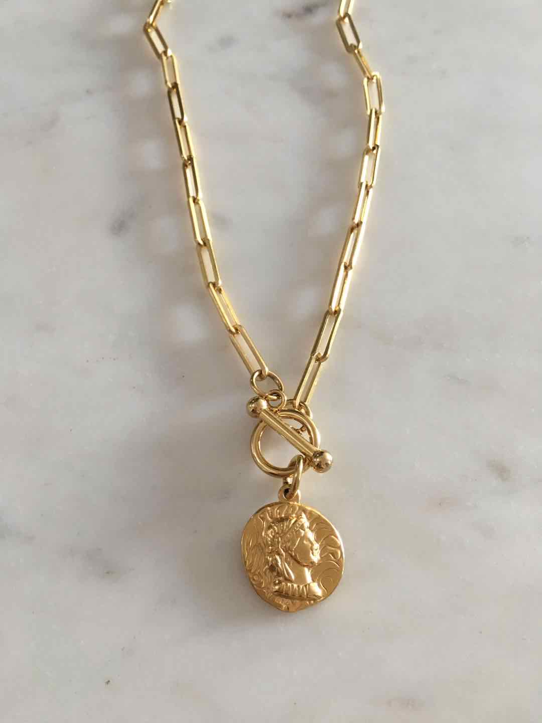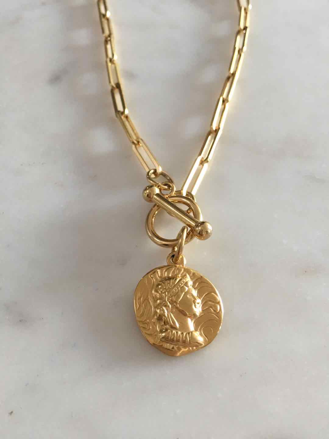 The Shiloh chain features a large, brilliant coin medallion charm. A thoughtful idea to wish someone good luck and prosperity.