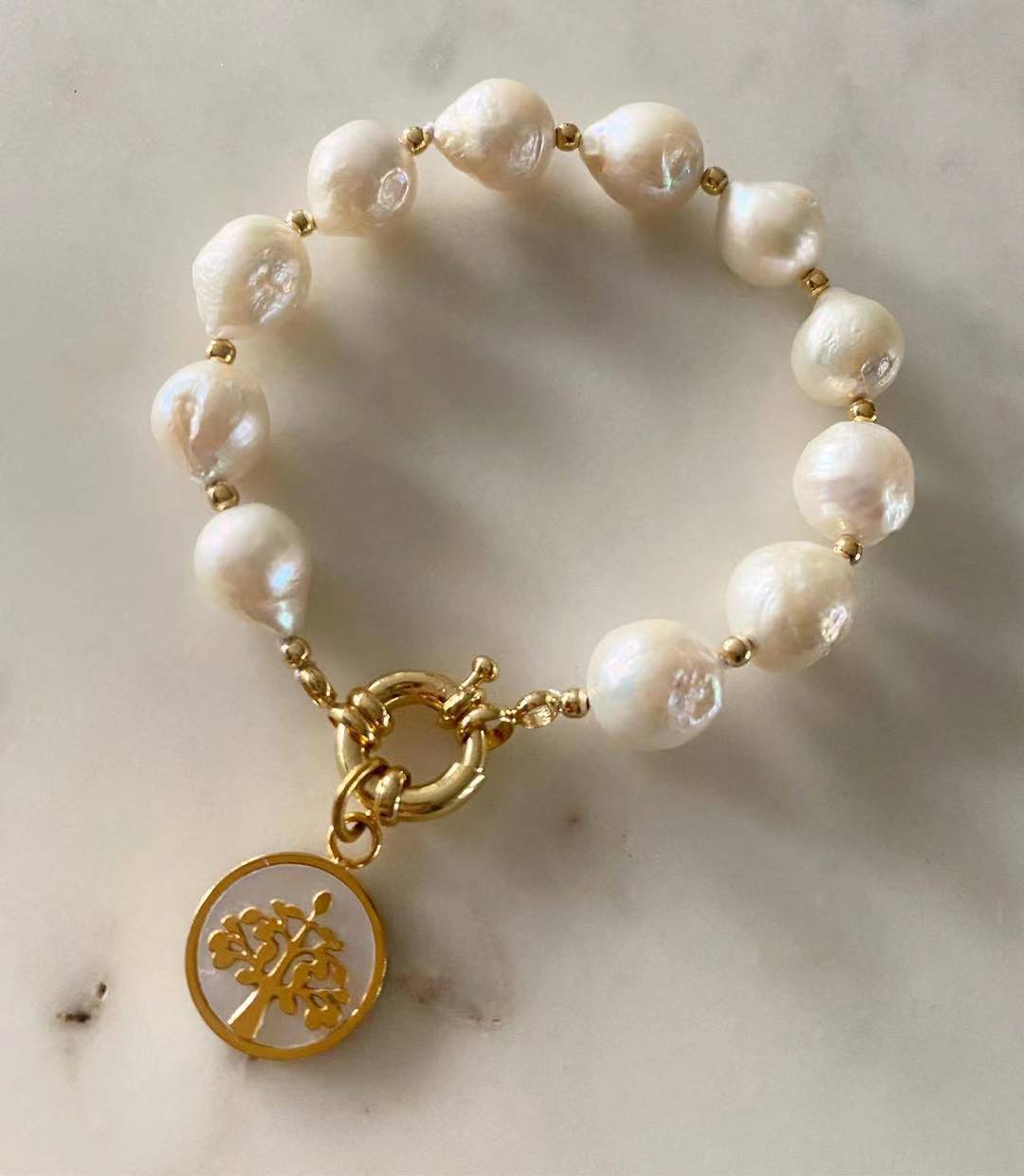 Material: Baroque pearl bracelet with gold plated toggle lock. Baroque pearl may vary in shape and size. Tree of Life charm is plated in stainless steel. Non tarnish. Hypoallergenic.