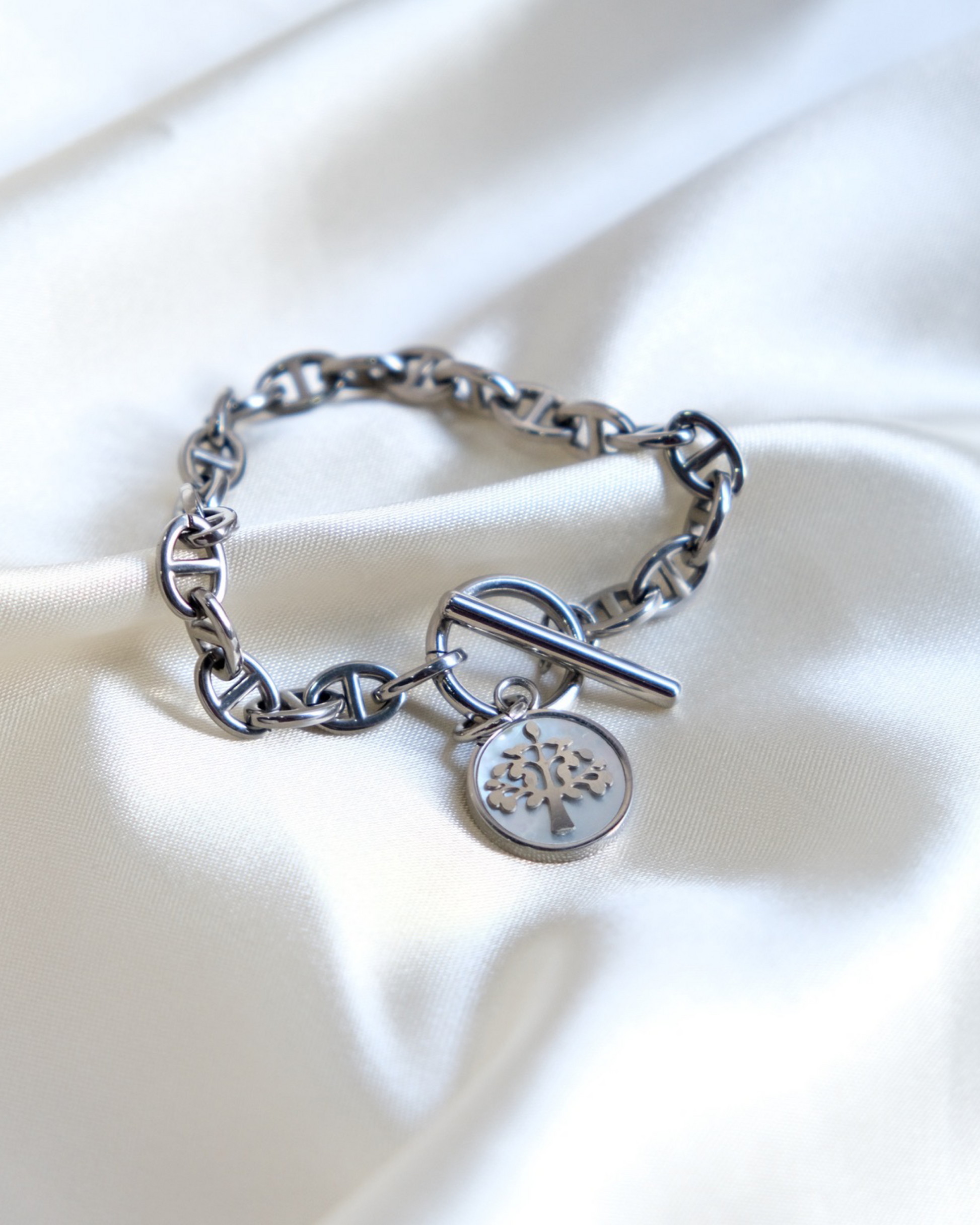 Tree of Life charm is plated in stainless steel. Non tarnish. Hypoallergenic.