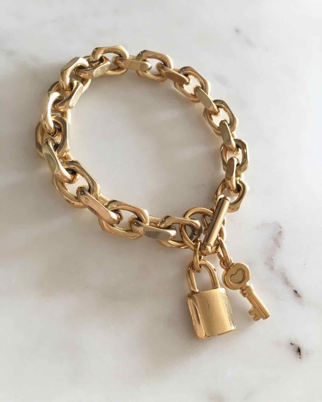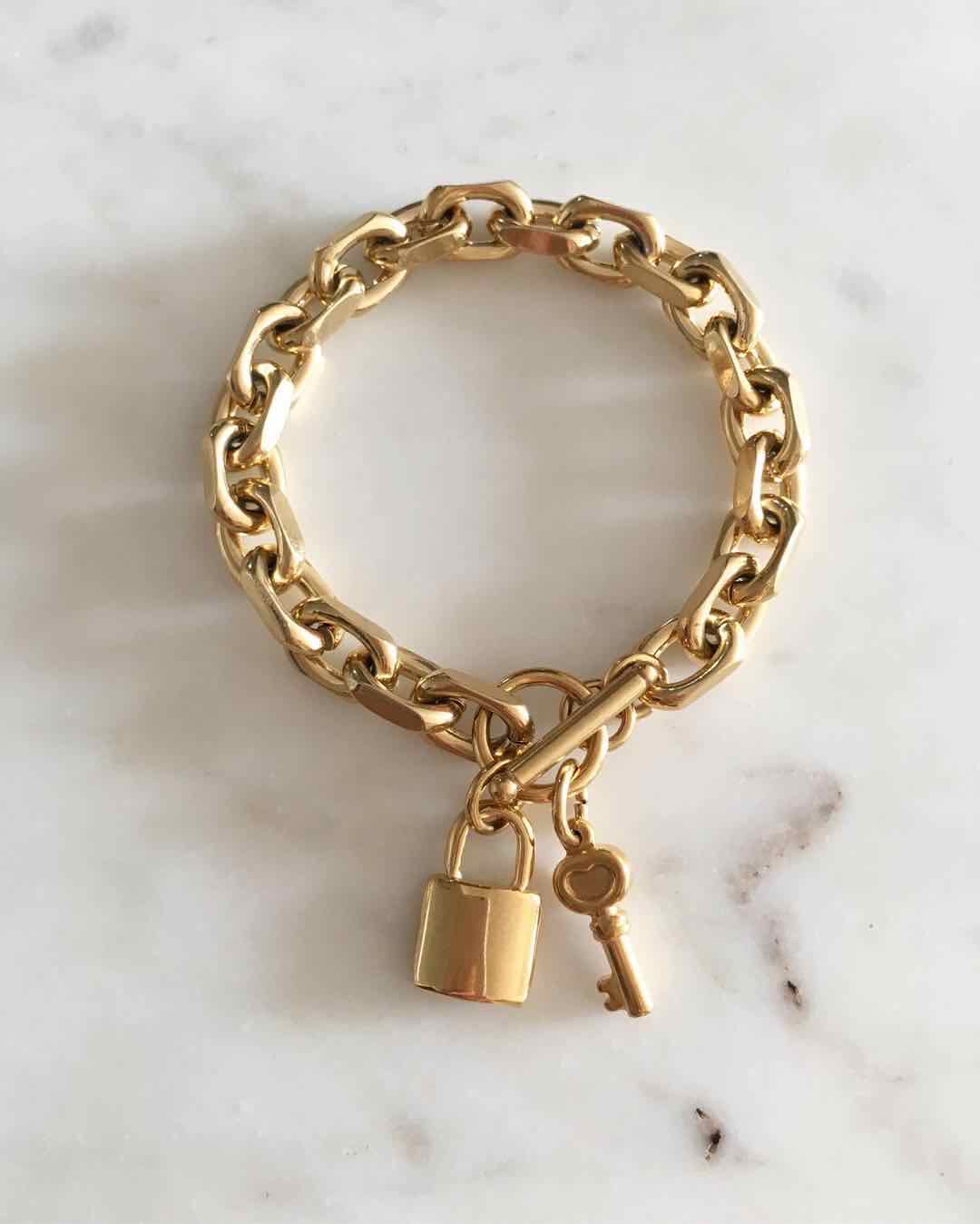 Attached to a gold-tone stainless chain, the central element features a lock and key pendant fit for those who like to keep their promises.